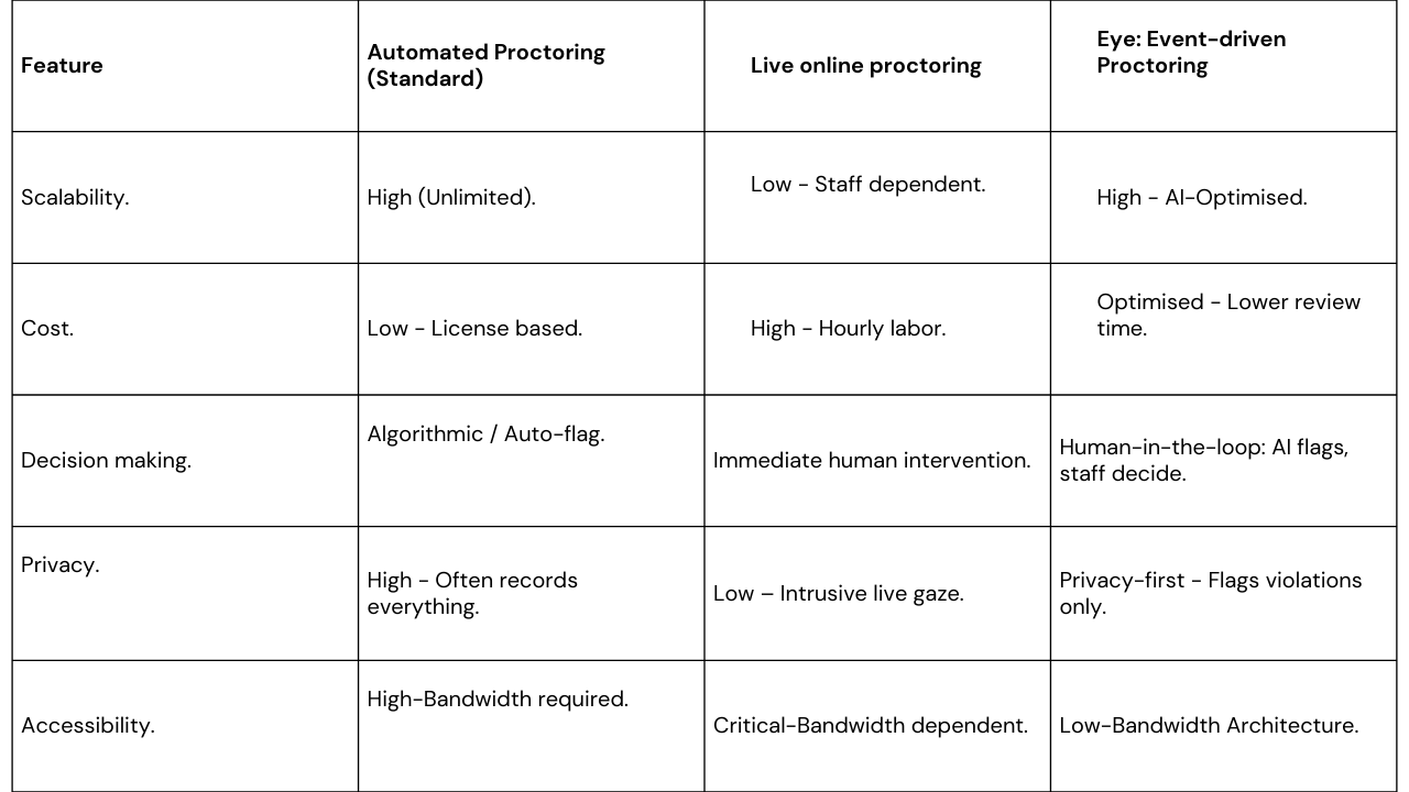 But in 2026, this “either-or” model is breaking down. With evolving privacy expectations, regulatory pressure, and the need for scalable assessments, institutions are moving toward a smarter approach: event-driven AI proctoring.
