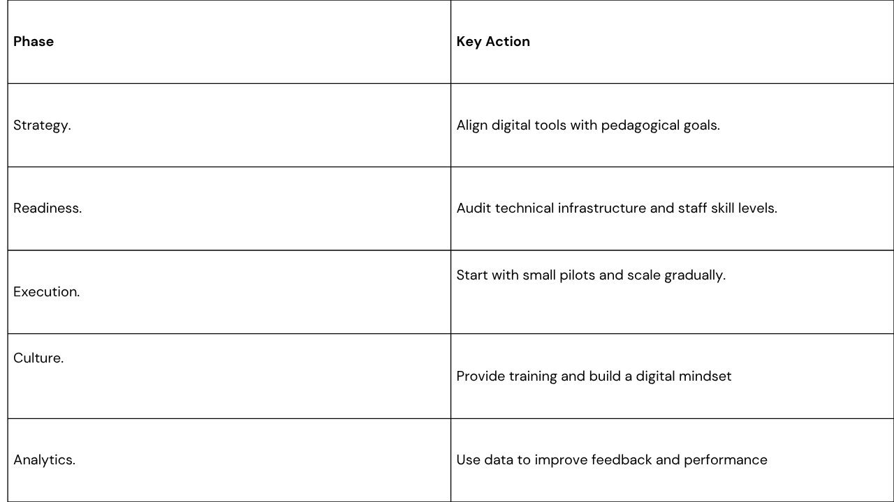 Without a clear plan, institutions risk investing in expensive tools that fail to improve learning outcomes or operational efficiency. Real success comes from strategic planning, where technology aligns with pedagogical goals, staff capabilities, and institutional infrastructure.